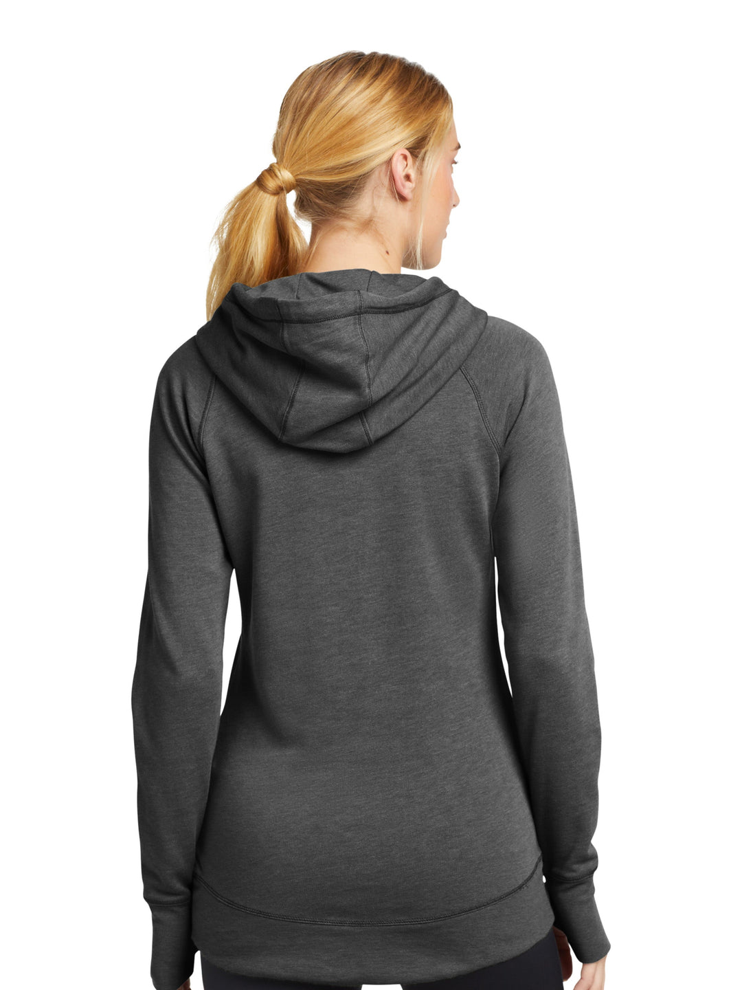Back view of the New Era Ladies Tri-Blend Fleece Pullover Hoodie in dark gray, highlighting its contoured fit and comfortable hood design.