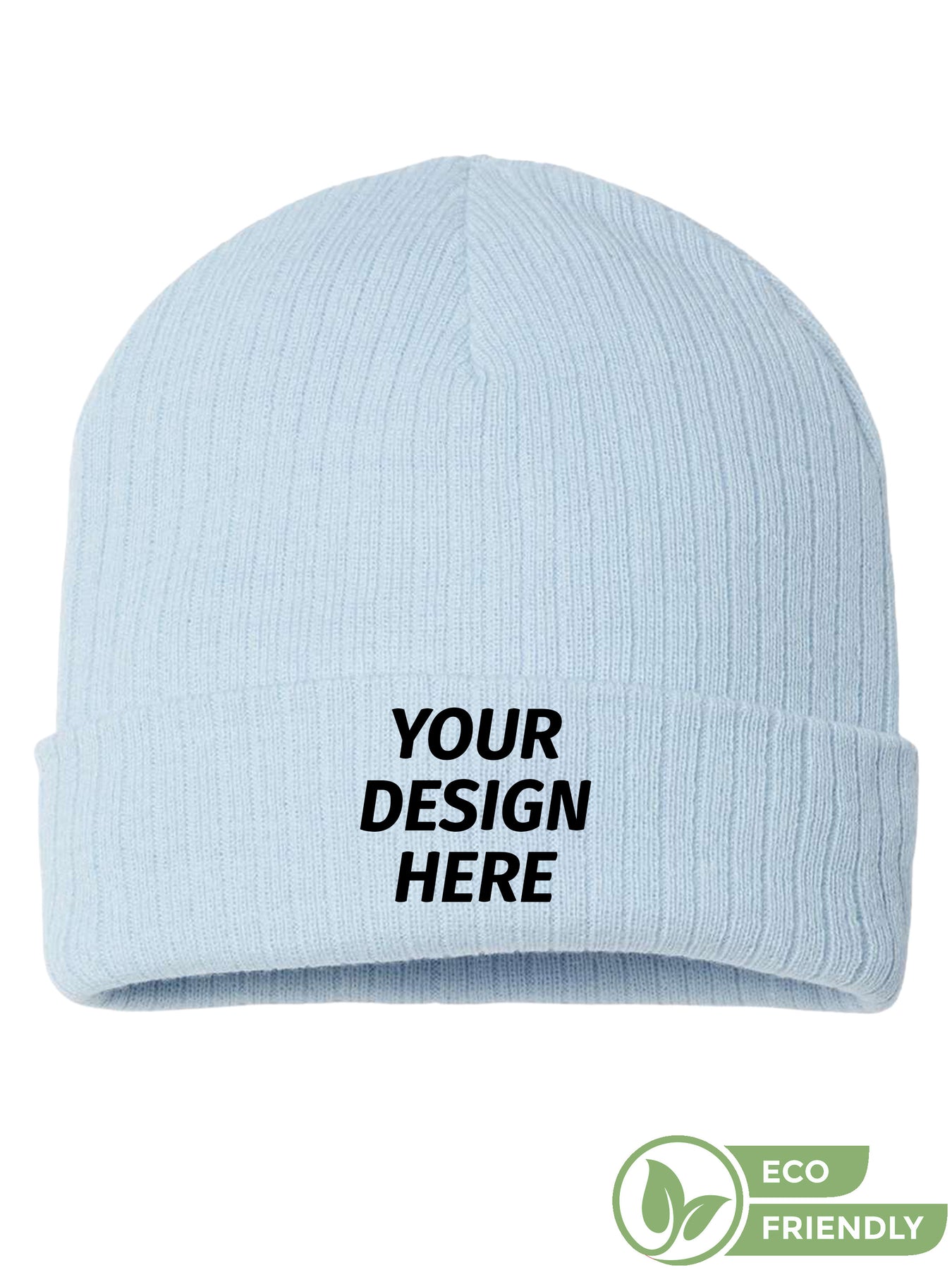 Light blue Atlantis Headwear Sustainable Rib Cuffed Beanie with ribbed knit texture. Eco-friendly and perfect for custom embroidery.