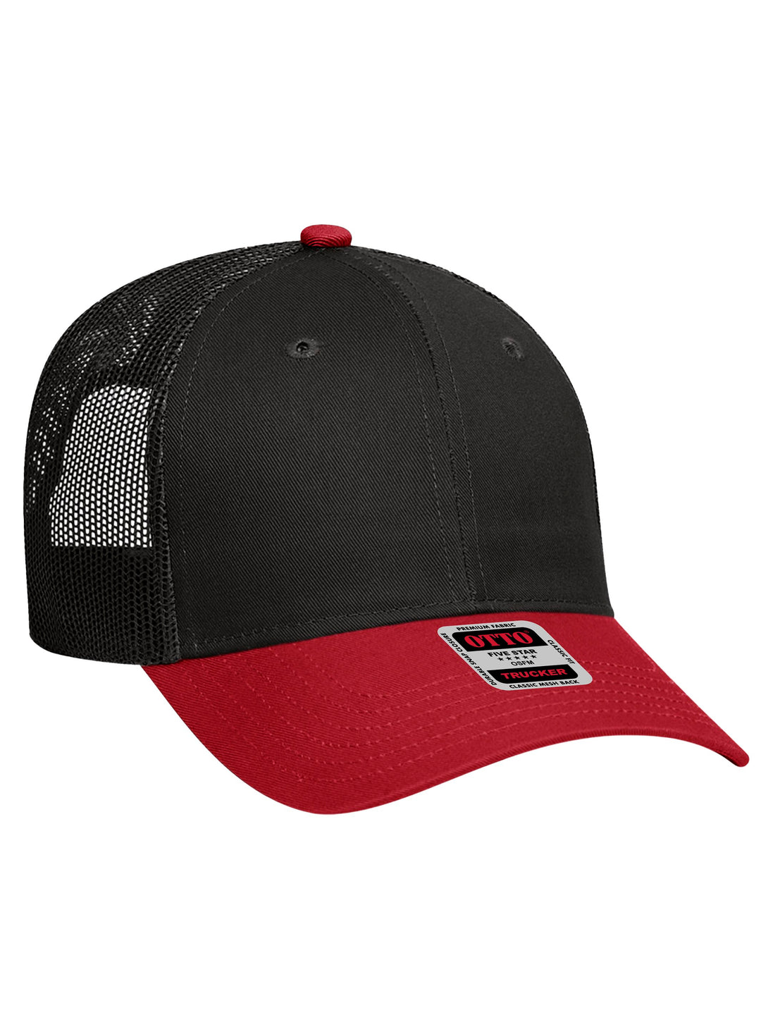 Black and red OTTO CAP trucker hat with mesh back and low profile front, ideal for custom embroidery or printing.