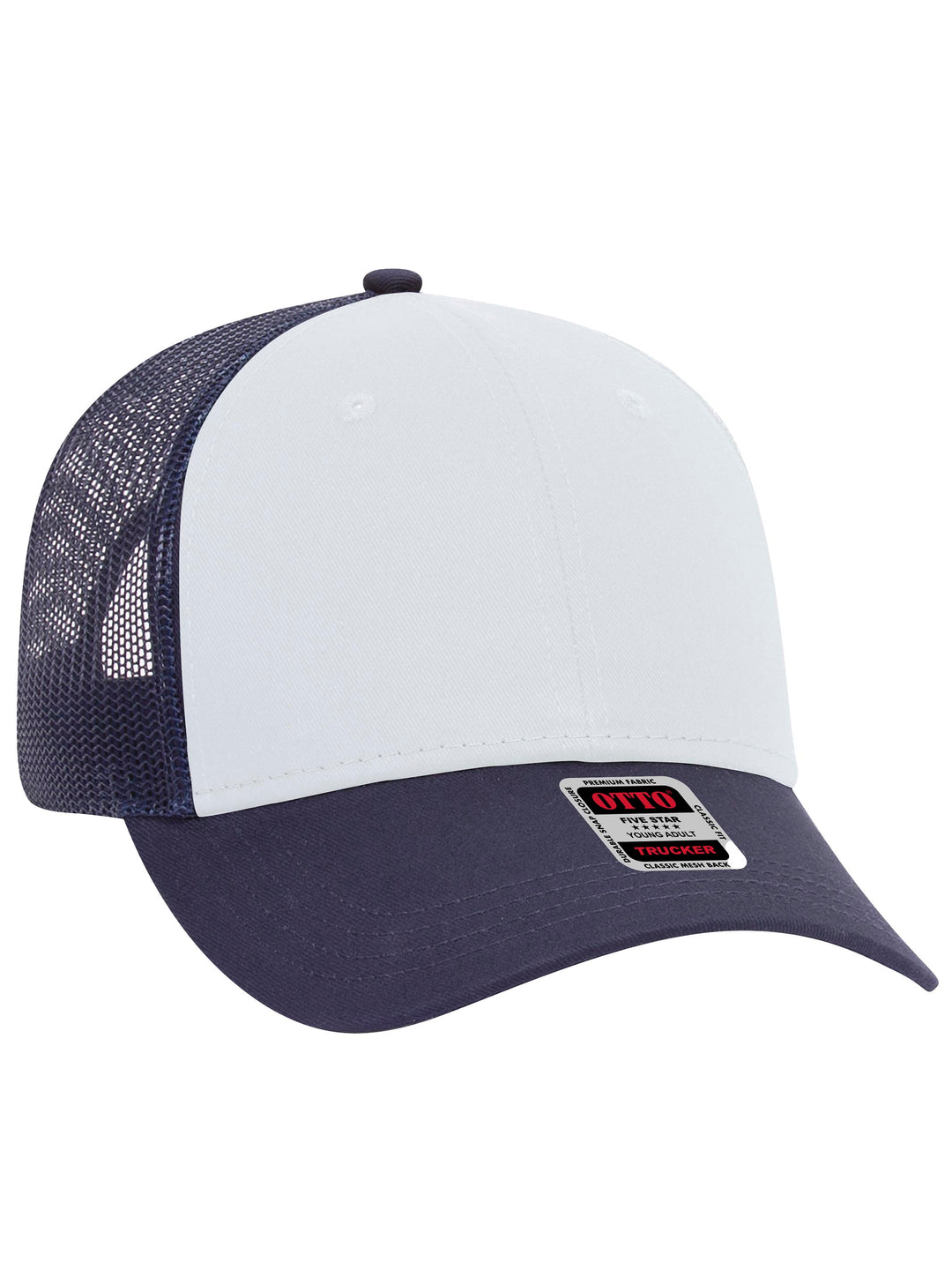 White and black OTTO trucker hat with mesh back and low profile front, ideal for custom embroidery or printed logos.
