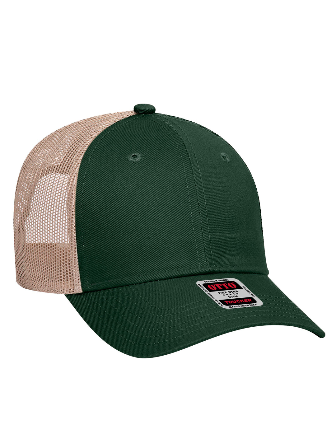 Dark green OTTO mesh back trucker hat with low profile front, great for personalized embroidery or logo printing.