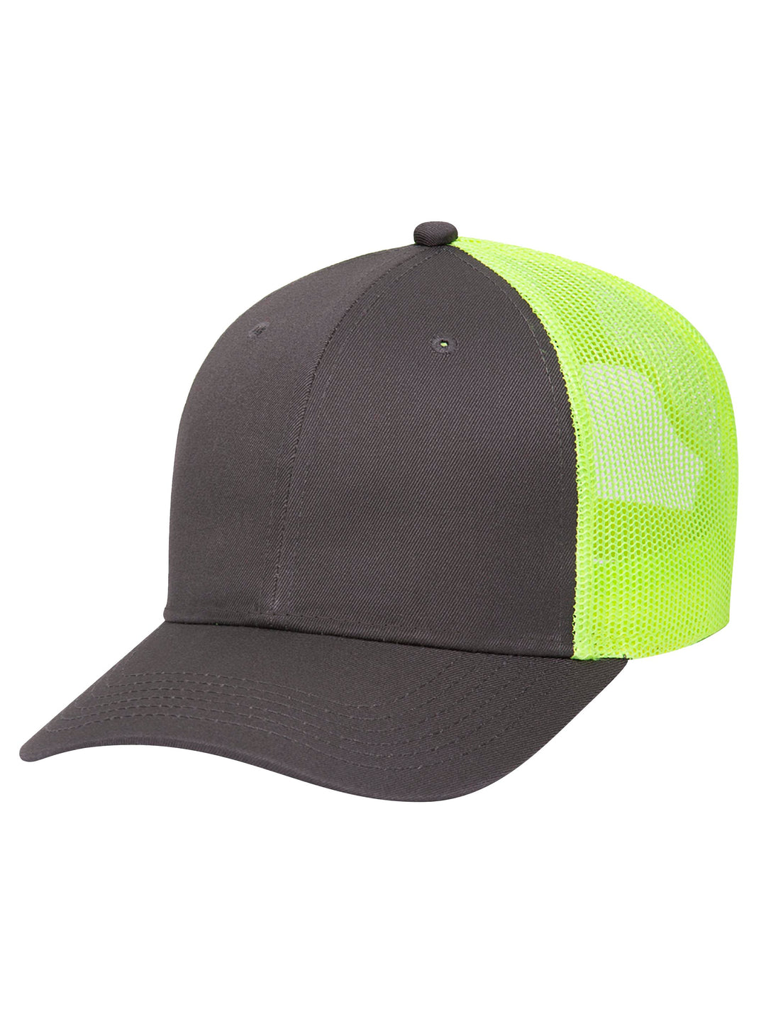 Front view of OTTO 6 panel low profile mesh back trucker hat in charcoal and neon yellow, perfect for custom logo embroidery.