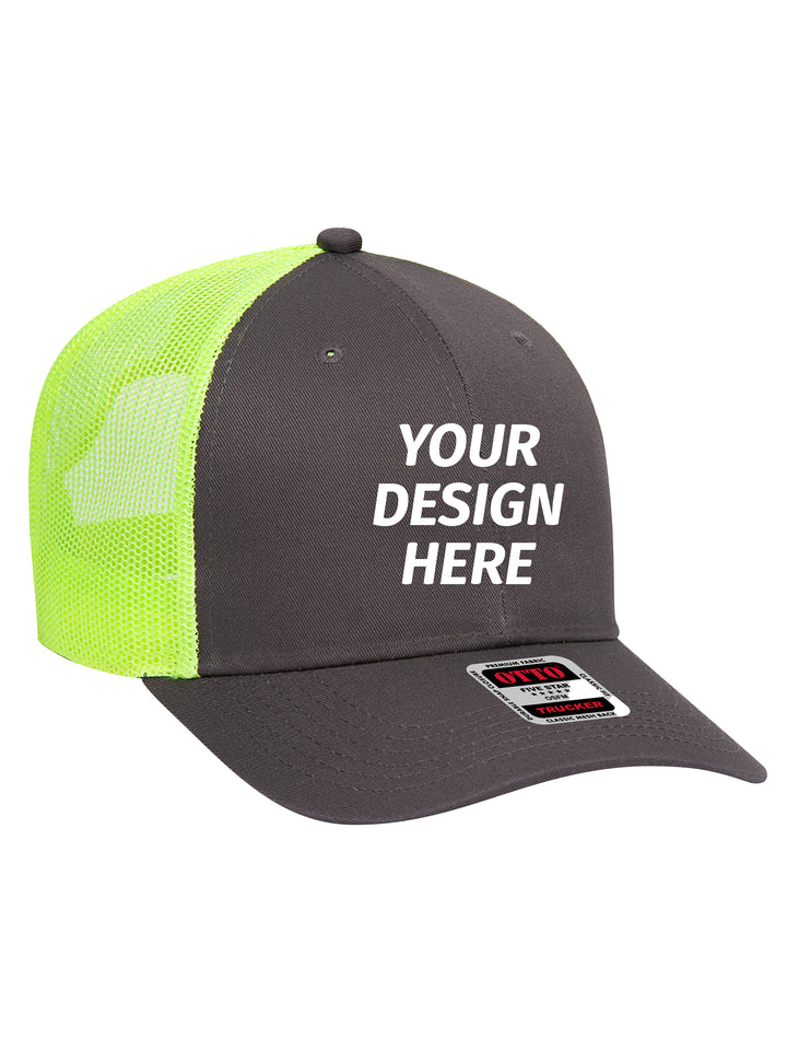 Custom OTTO CAP low profile trucker hat in charcoal and neon yellow with mesh back, ideal for personalized embroidery or DTF printing.