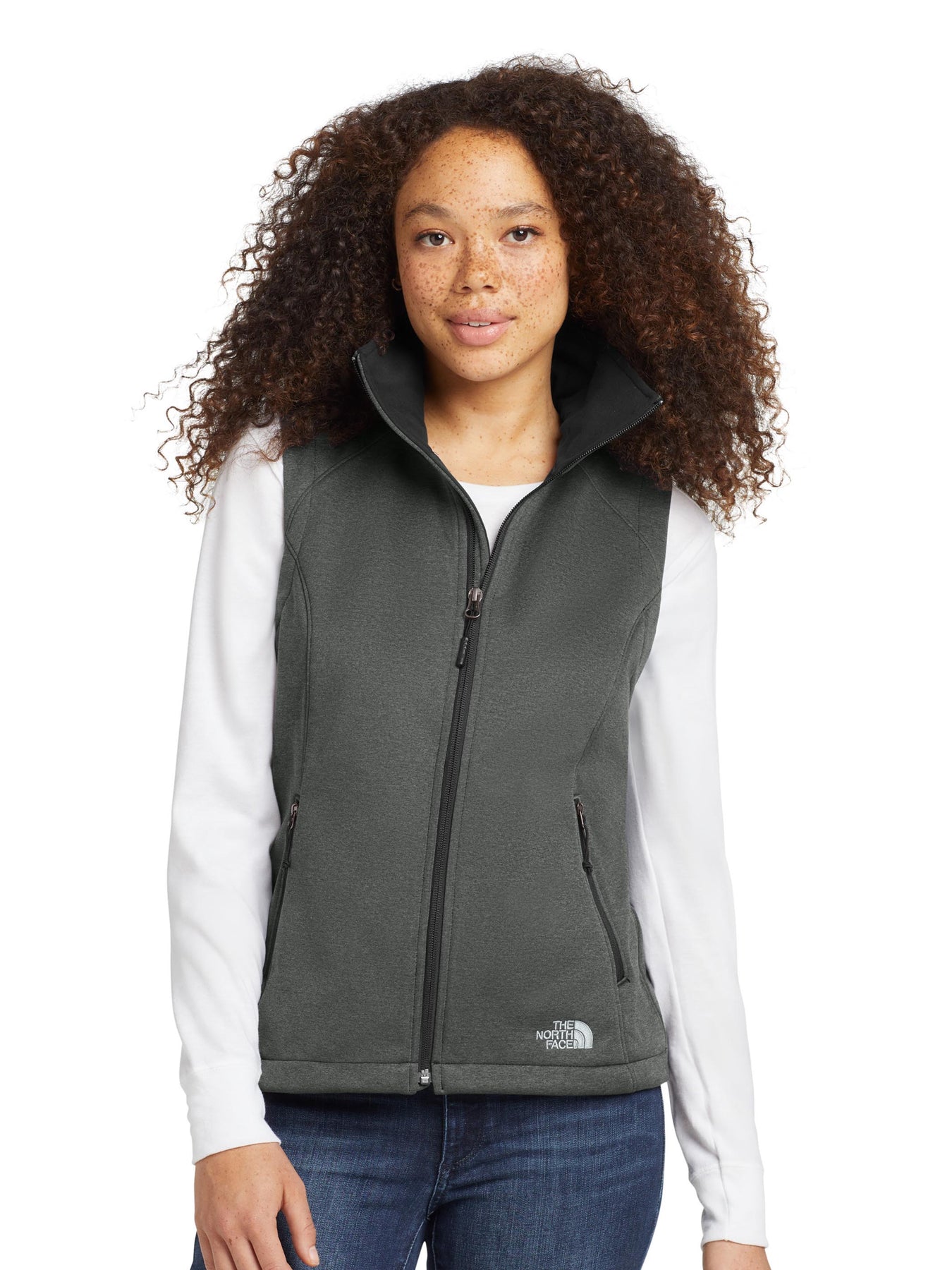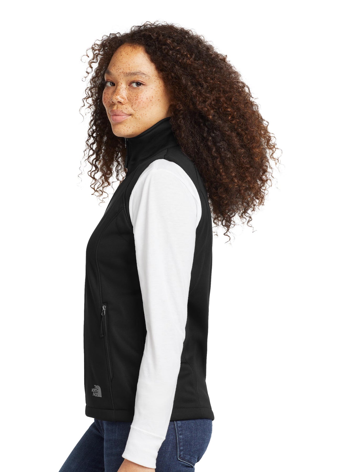 The North Face® Women's Ridgewall Soft Shell Vest in black with 'Your Design Here' text, ideal for custom embroidery and personalized workwear.